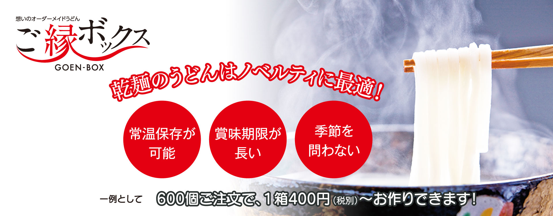 味に定評のある金トビのうどんを、オリジナルパッケージでノベルティとして制作する【ご縁ボックス】です。